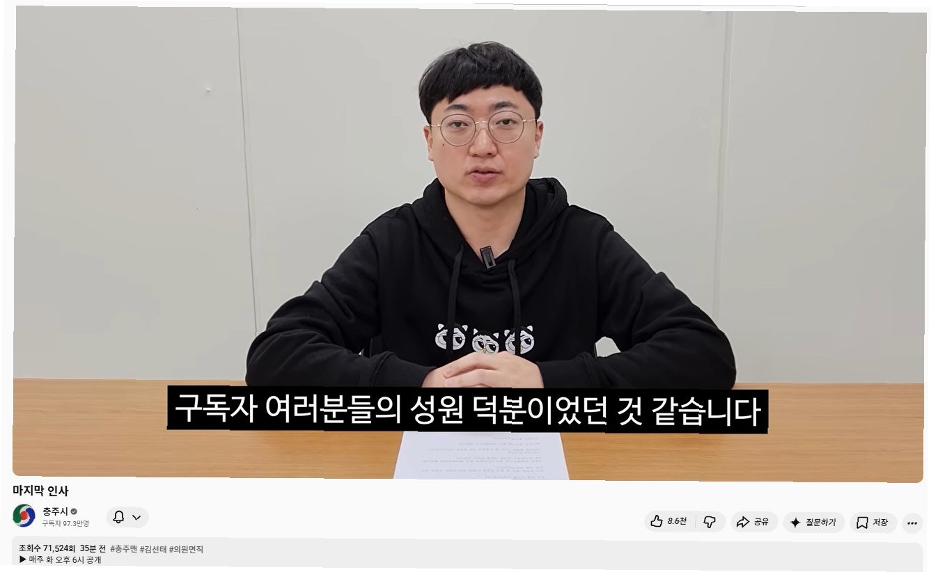 충주시 공식 유튜브 채널 ‘충TV’를 성공적으로 이끌어 온 ‘충주맨’ 김선태 주무관이 최근 사직서를 제출하며 퇴직 의사를 밝힌 것으로 알려졌습니다. 이 소식이 전해지면서, 과거 그가 방송에서 했던 ‘순장 위기’ 발언이 다시금 주목받고 있습니다. 김 주무관은 과거 한 방송에서 시장 임기 만료와 함께 자신의 역할도 마무리하고 싶다는 의사를 내비친 바 있습니다. 그의 퇴직 소식은 ‘충TV’가 충주시 인구의 4배가 넘는 구독자를 확보하며 지방자치단체 유튜브 채널의 대표적인 성공 사례로 자리매김한 상황에서 더욱 큰 관심을 받고 있습니다.