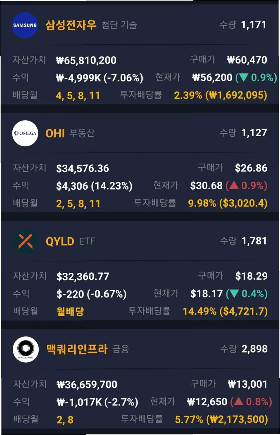 2.  주가 하락 방어: 배당금은 주가 하락 시 손실을 일부 보전해주는 완충 작용을 합니다. 배당 수익률이 높을수록 주가 하락에 대한 방어력도 커집니다.