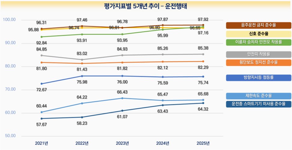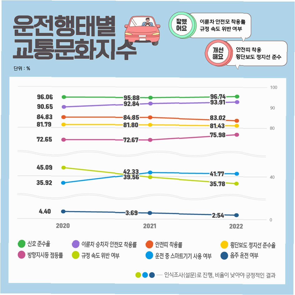A.운전자의 신호 위반, 보행자의 무단횡단, 뒷좌석 안전띠 및 유아용 카시트 착용률 등입니다.