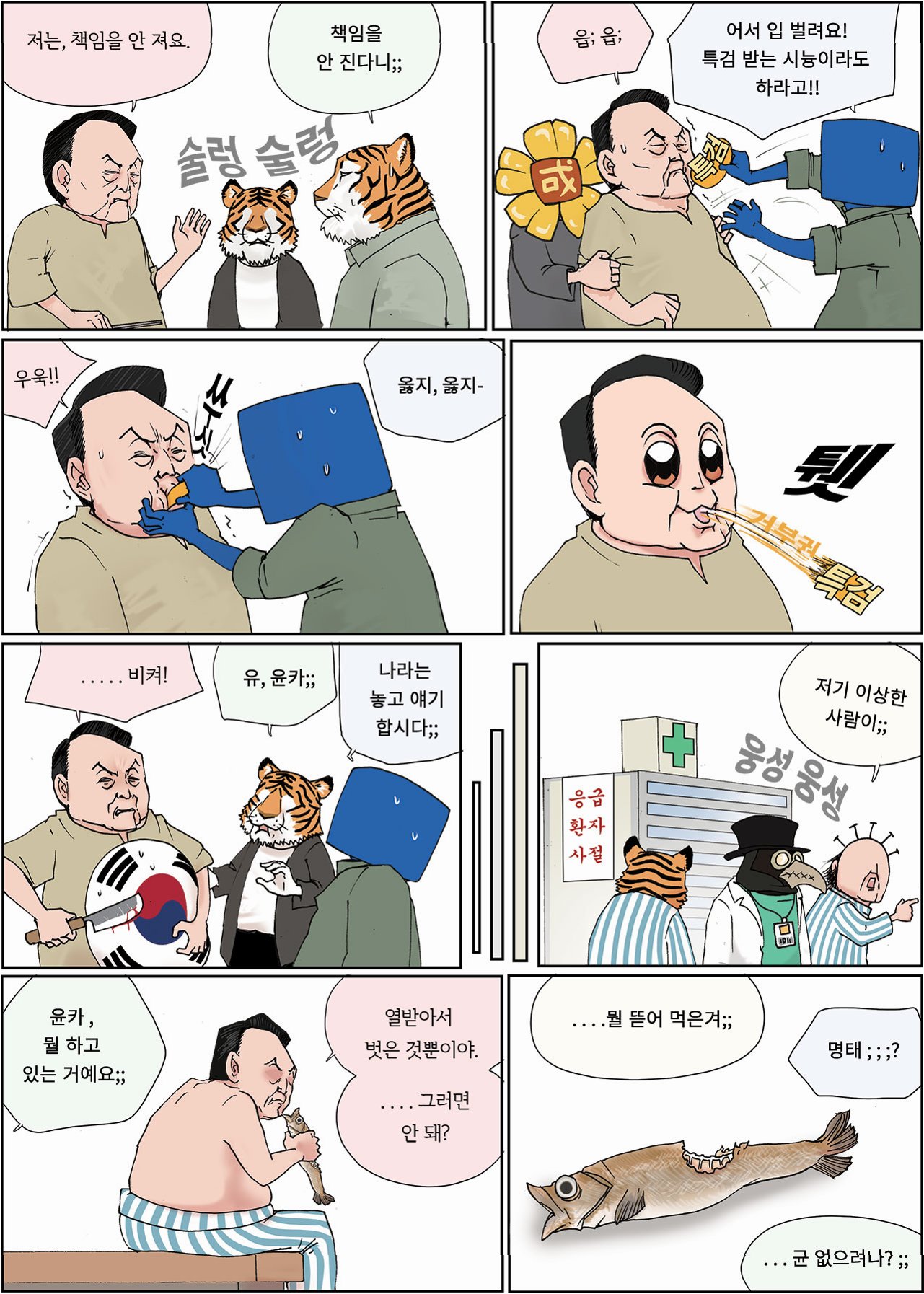 A.시사 풍자와 서브컬처의 독창적인 조합, 유쾌한 유머, 날카로운 시사 풍자가 굽시니스트 만화의 매력입니다.