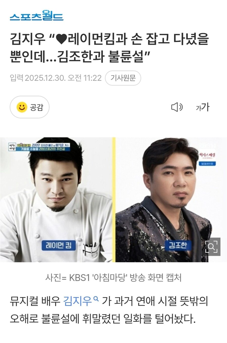 소문의 발단은 레이먼 킴과 김조한의 외모적 유사성이었습니다. 김지우는 당시 연애 중이었던 레이먼 킴과 함께 다니는 모습이, 같은 지역에서 레스토랑을 운영하던 김조한과 오해를 불러일으켰다고 설명했습니다. 두 사람이 외모뿐 아니라 직업까지 비슷해, 더욱 소문이 확산되는 결과를 낳았습니다. 이러한 상황은 김지우에게 예상치 못한 어려움을 안겨주었습니다.