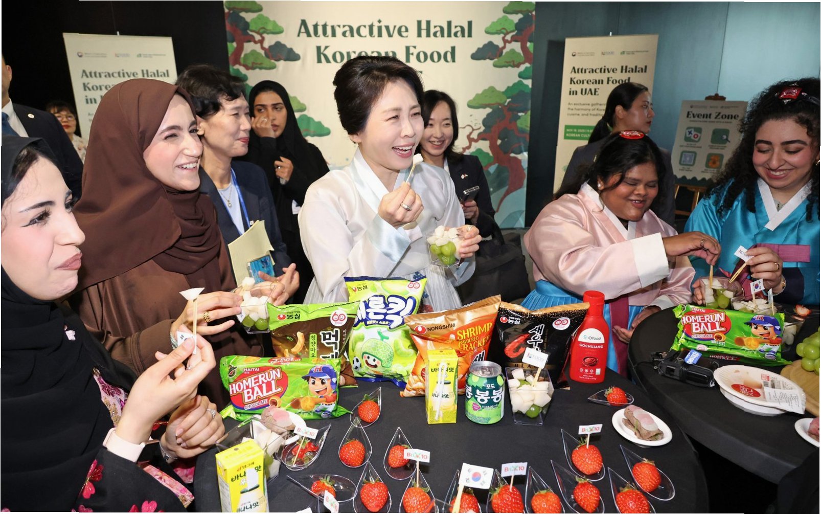 할랄(Halal) 인증은 무슬림이 섭취할 수 있도록 이슬람 율법에 따라 도축, 가공, 조리된 식품에 부여됩니다. 중동 지역은 무슬림 인구가 많아 할랄 인증 식품에 대한 수요가 높습니다. 김 여사는 할랄 인증을 받은 한우 등심구이, 한국 딸기 등 다양한 K-푸드를 소개하며, 현지인들의 관심을 끌었습니다. 이는 K-푸드의 중동 시장 진출을 위한 중요한 발판을 마련하는 데 기여할 것입니다.