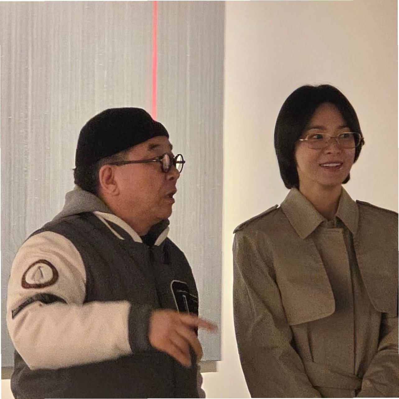 공개된 사진 속 송혜교는 민낯에 가까운 얼굴과 은테 안경, 단발머리로 수수한 차림이었지만, 특유의 분위기로 전시장 공간을 화보처럼 만들었습니다. 그녀는 작품 설명을 경청하며 밝게 미소 짓는 모습으로 대선배인 김수철을 향한 존경심과 예의 바른 태도를 보여주었습니다. 이러한 모습은 많은 이들의 시선을 사로잡았습니다.