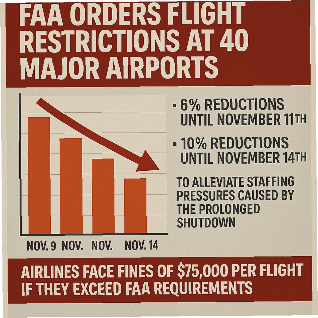 A.셧다운 장기화로 인한 관제사 인력 부족과 안전 우려를 해소하기 위해 FAA는 40개 주요 공항의 항공편 운항을 10%까지 단계적으로 감축했습니다.