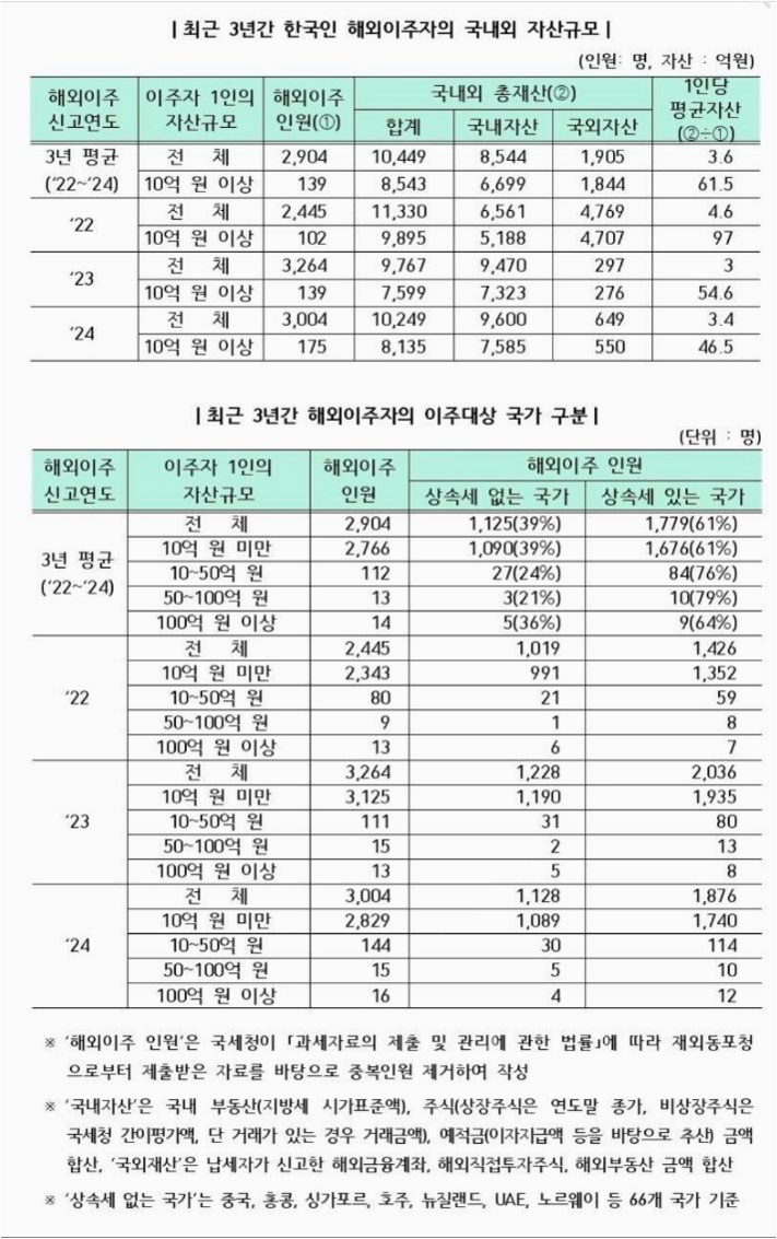 임광현 국세청장의 발표에 따르면, 2022년부터 2024년까지 3년간 해외이주를 신고한 인원은 연평균 2,904명이었습니다. 이 중 10억 원 이상 자산을 보유한 경우는 연평균 139명에 불과한 것으로 나타났습니다. 이는 전체 해외이주자 중 극소수에 해당하며, '부자들이 상속세 때문에 대거 한국을 떠난다'는 주장을 뒷받침하기에는 부족한 수치입니다.