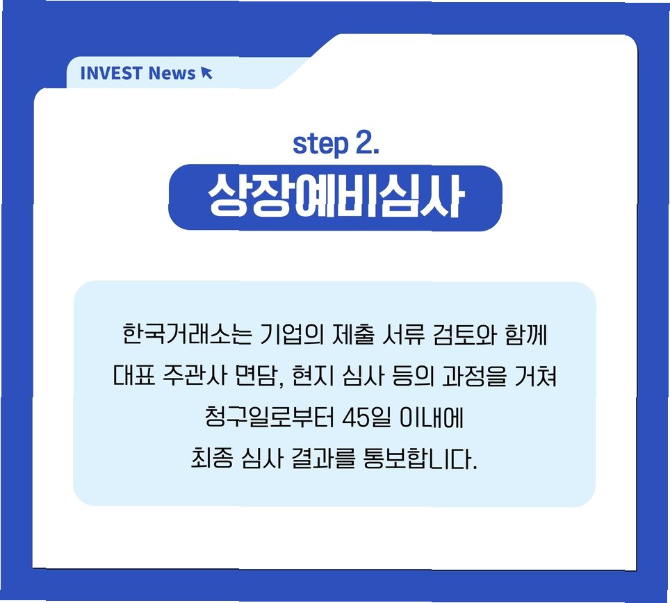 4.  심사 결과 통보: 심사 결과에 따라 상장 승인, 조건부 승인, 또는 부적격 판정을 받게 됩니다. 승인을 받으면, 본격적인 상장 절차를 진행할 수 있습니다.