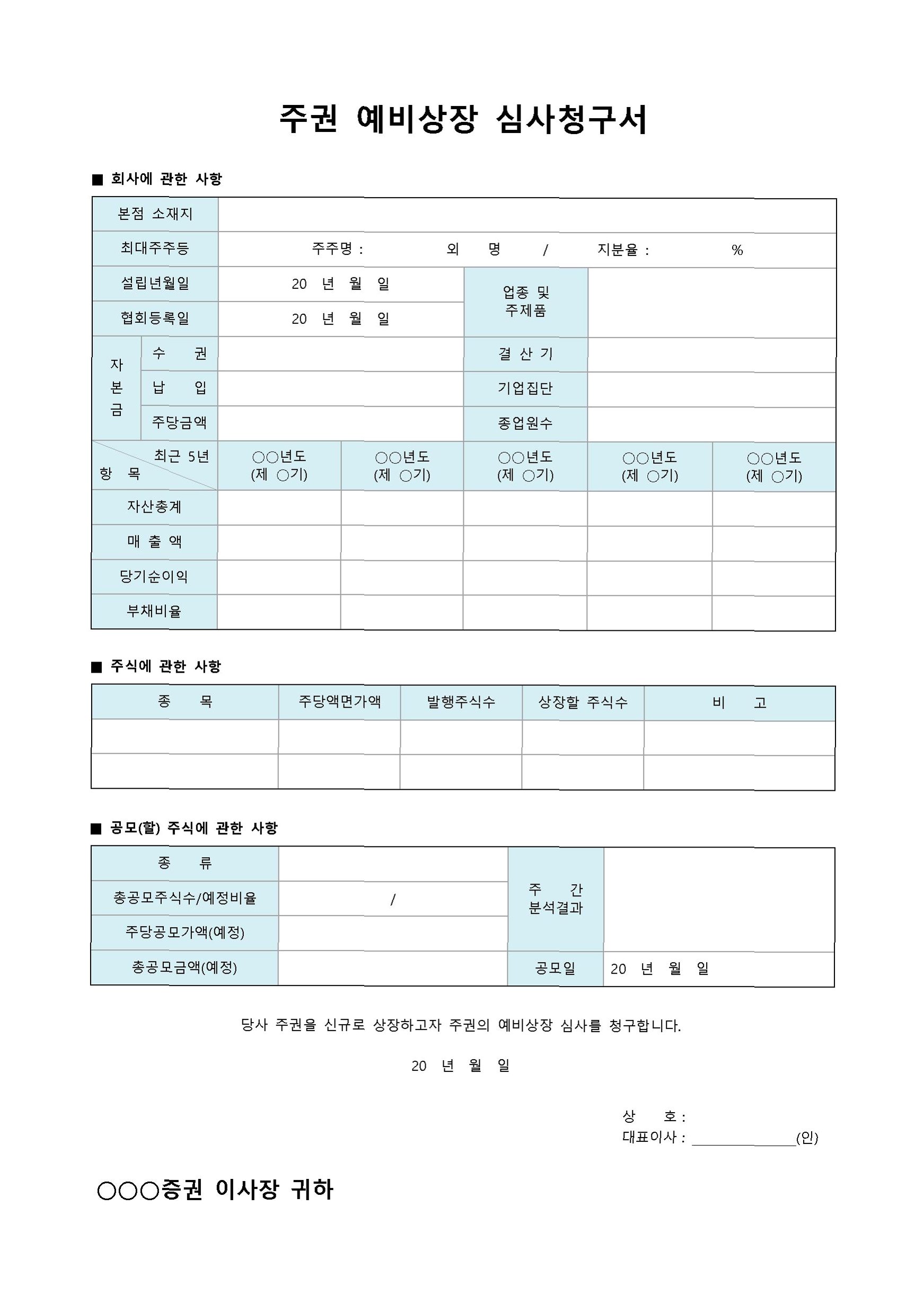 2.  심사 청구: 한국거래소에 상장 예비 심사 청구서를 제출합니다. 이와 함께 필요한 모든 서류를 제출해야 합니다.