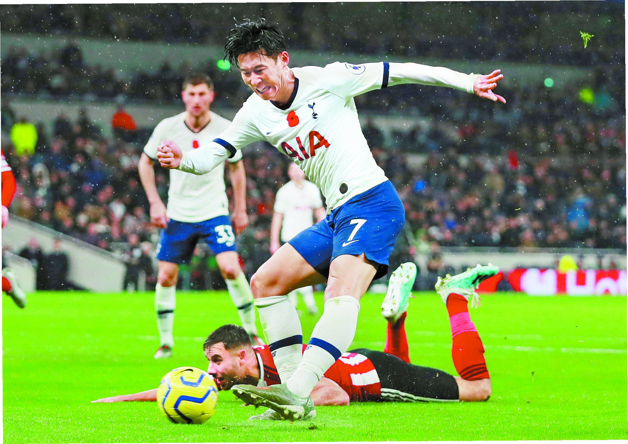 A.영국 매체 더선은 손흥민이 거친 태클에 분노하여 상대 선수와 정면으로 맞서 몸싸움을 벌였다고 보도하며, 이례적인 장면에 주목했습니다.