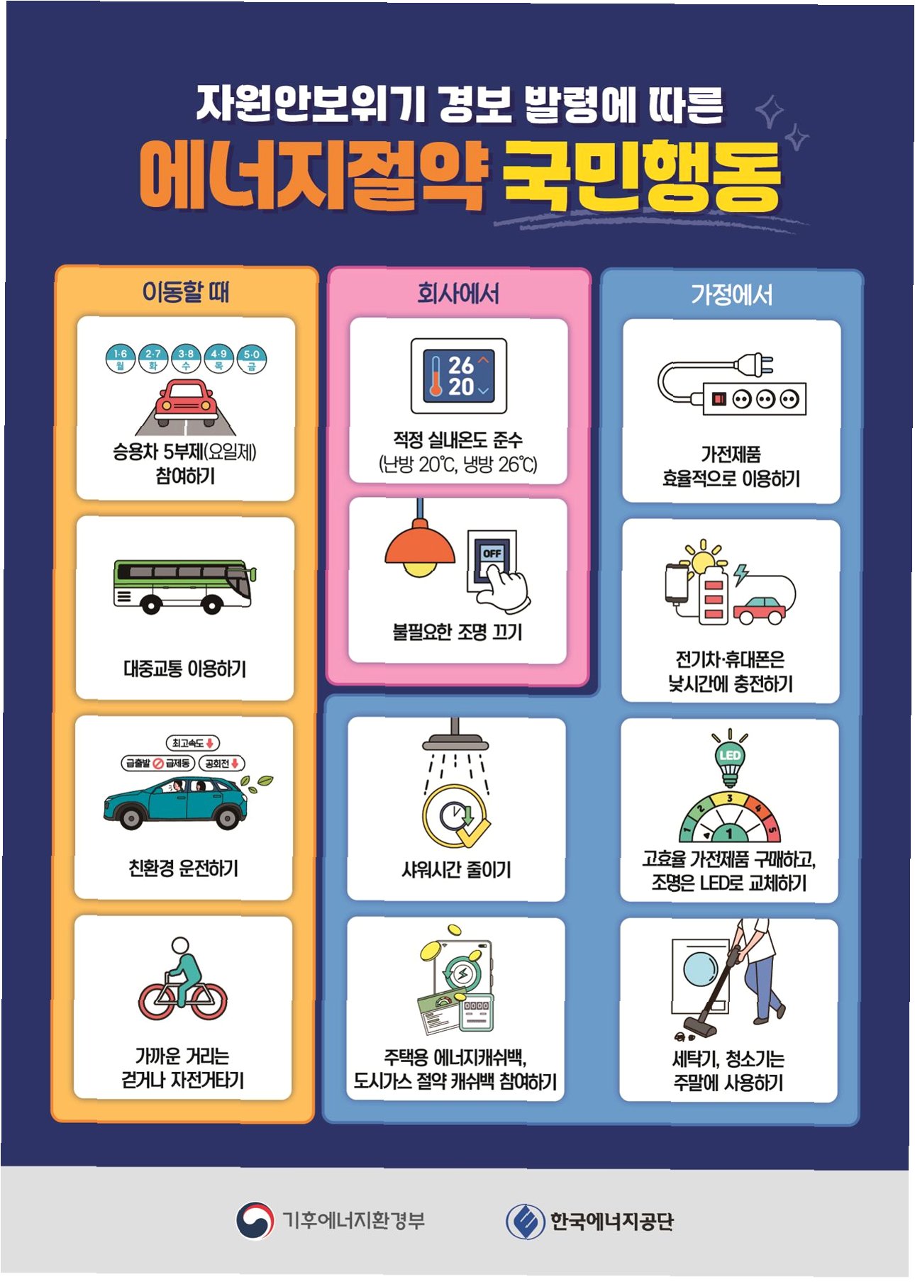 정부는 중동발 에너지 위기에 대응하기 위해 공공부문 차량 5부제 의무화, 민간 자율 참여 권고, 기업 에너지 절감 독려, LNG 소비 최소화 및 재생에너지 확대 등 다각적인 정책을 추진합니다. 또한, 승용차 5부제 참여, 대중교통 이용, 적정 실내온도 유지 등 12가지 국민 행동 지침을 홍보하며 생활 속 에너지 절약 실천을 강조하고 있습니다. 이는 에너지 안보 강화와 지속 가능한 미래를 위한 우리 모두의 노력이 필요한 시점임을 시사합니다.