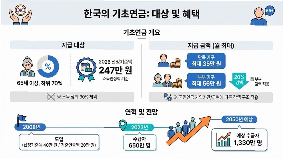 이재명 대통령이 기초연금의 현행 수급 자격 기준에 대해 의문을 제기하면서, 정부가 기초연금 선정 기준액과 소득 인정액 산정 방식의 전면적인 개편을 검토하기로 했습니다. 현재 기초연금은 65세 이상 노인 중 소득 하위 70%에게 지급하는 것을 원칙으로 하고 있으며, 이는 국민연금공단 연구원에 따르면 월 최대 34만원대(단독가구 기준) 수준입니다. 하지만 이 기준이 되는 '소득 인정액' 산정 방식에 허점이 있다는 지적이 제기되고 있습니다.