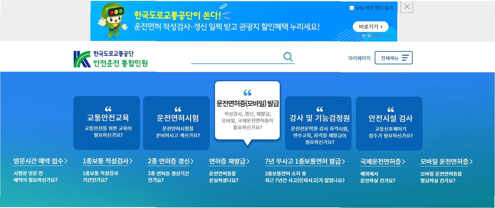 A.적성검사 신청, 면허증 재발급 등 대부분의 운전면허 행정 업무를 온라인으로 처리할 수 있습니다.
