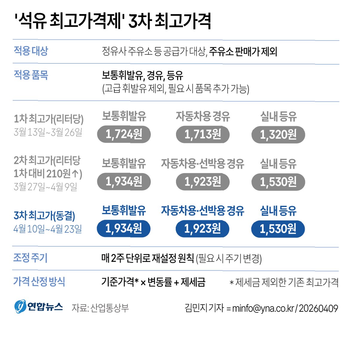 오늘부터 적용되는 석유제품 공급가의 3차 최고가격이 이전과 동일한 수준으로 유지됩니다. 휘발유는 리터당 1,934원, 경유는 1,923원, 등유는 1,530원으로 결정되었습니다. 이는 국제 유가 하락과 더불어 민생 물가 안정을 최우선으로 고려한 결정입니다.