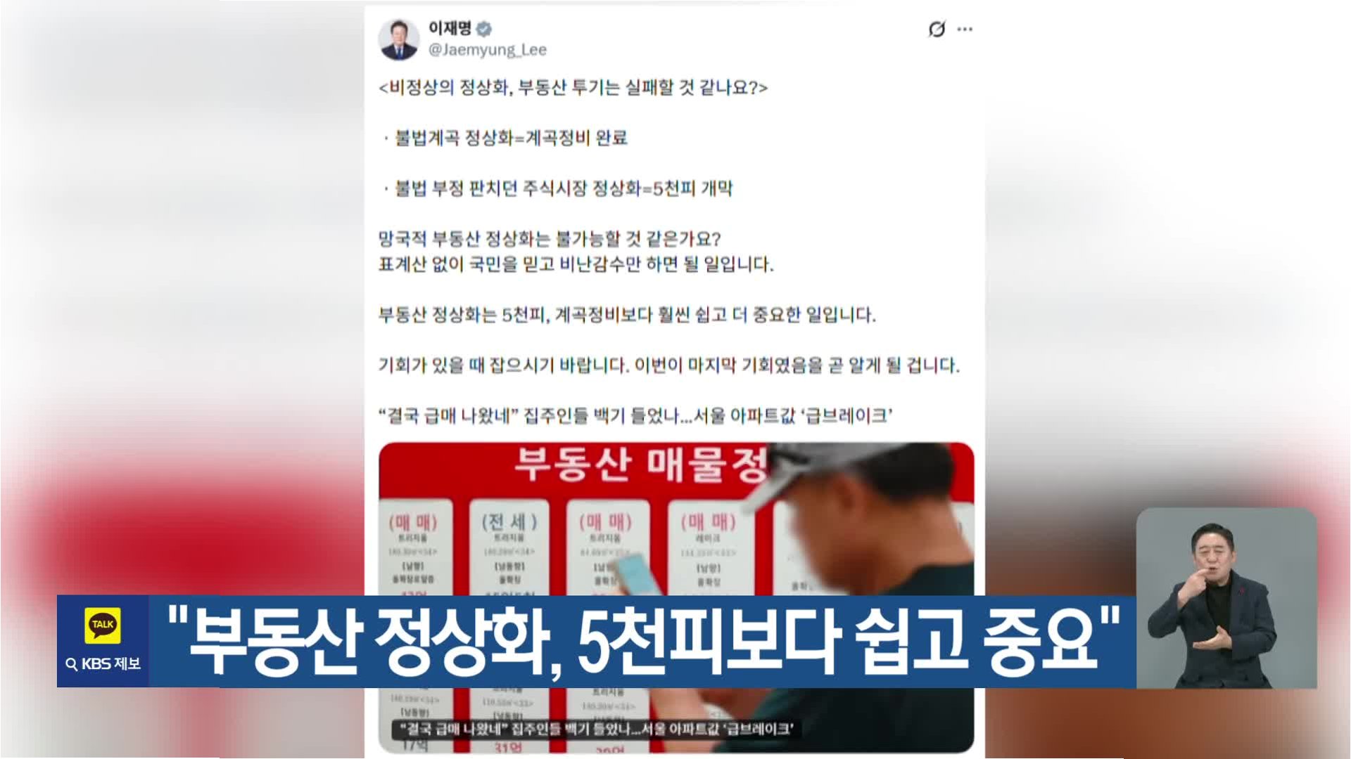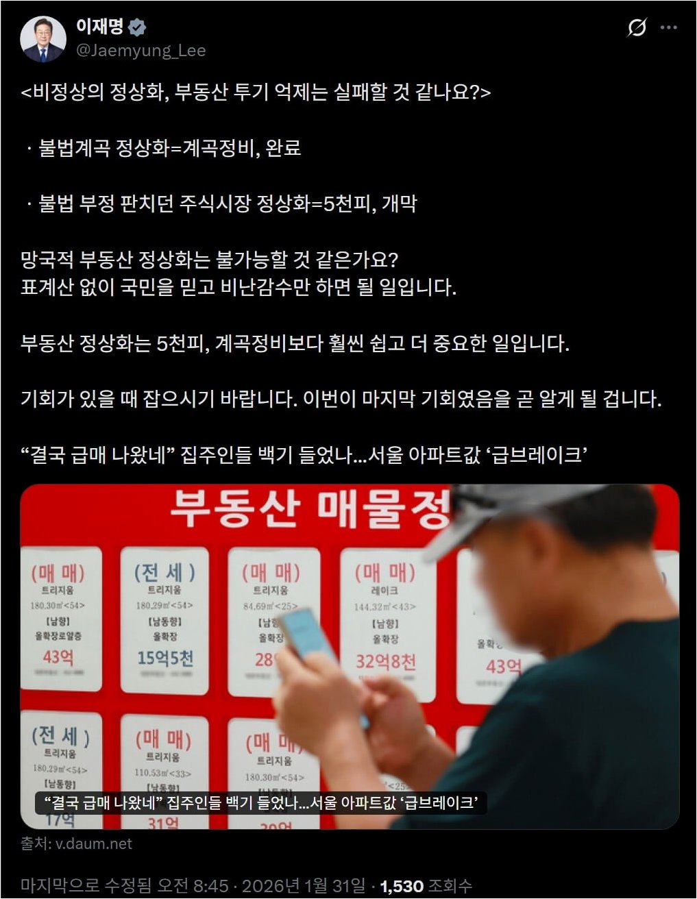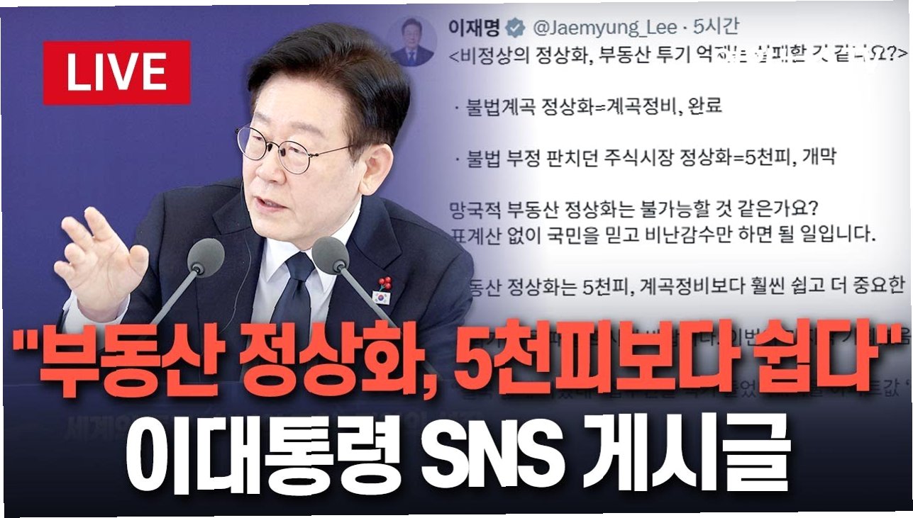 최근 정부가 부동산 세제 개편 검토 가능성을 시사한 이후, 서울 아파트값이 소폭 하락했다는 기사를 공유하며 이 대통령은 현 상황을 진단했습니다. 이러한 시장의 미세한 변화를 포착하며, 정부의 정책적 개입이 부동산 시장에 미치는 영향을 주시하고 있음을 보여줍니다.