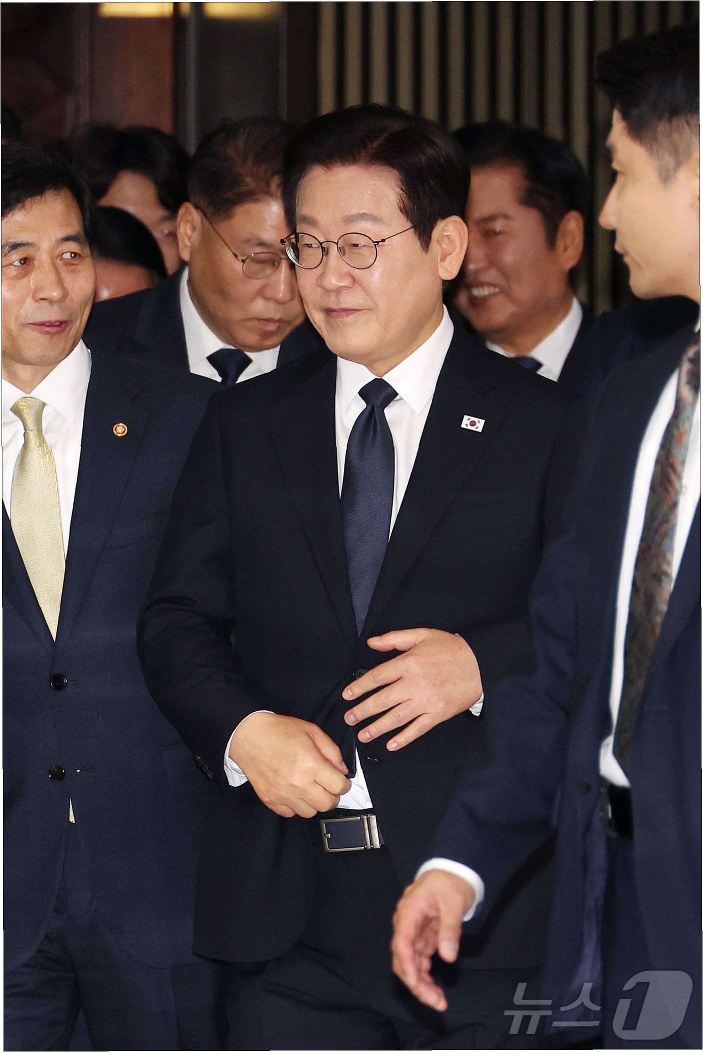 이재명 대통령은 국민의힘 의원들 앞에서 미소를 지으며 목례를 하고 손 인사를 건넸다.  일부 국민의힘 의원들이 “악수하지 말고 그냥 가라”며 소리치자, 이 대통령은 목례를 한 뒤 오른손을 들어 손 인사를 하고 국회의장실로 떠났다.