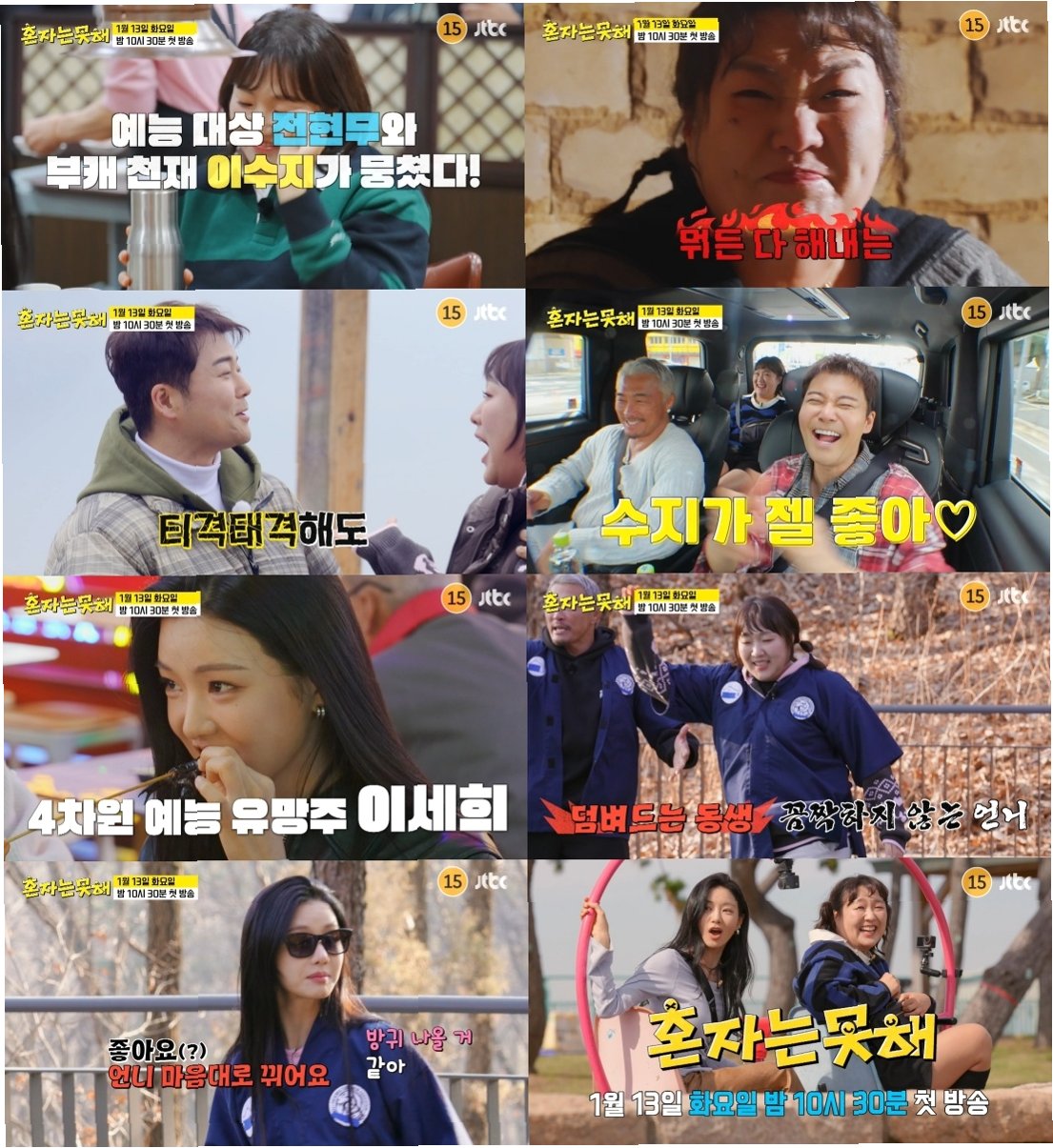 전현무, 추성훈, 이수지, 이세희가 '혼자는 못 해'에서 새로운 조합을 선보이며 찜질방 끝장내기에 나선다. 93도 찜질방 대결, 숯불 지니 추성훈, 찜질퀸 선우용여와 이수지, 이세희의 찰떡 케미 등 다양한 볼거리가 시청자들을 기다린다. 야외 포스터 공개로 기대감을 높이며, 1월 13일 첫 방송을 앞두고 있다.