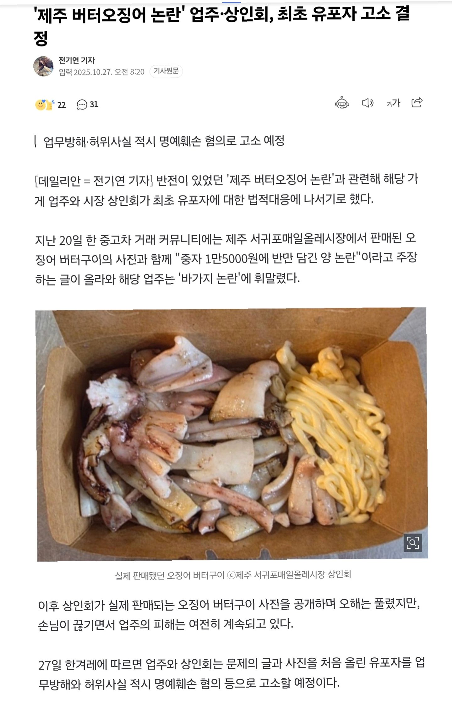 핵심 정리: 제주 올레시장 오징어 논란, 허위 게시글 작성자 고소로 마무리