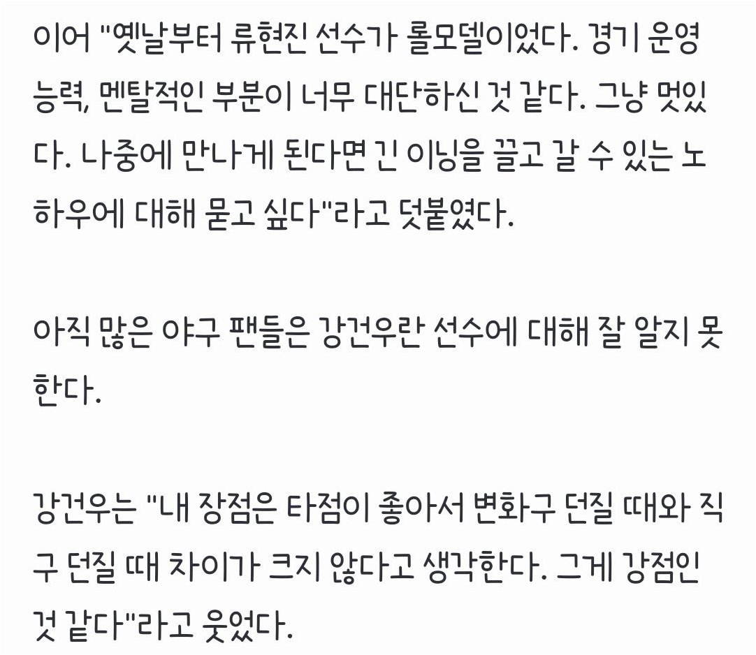 우상인 류현진을 아직 직접 보지 못했다는 강건우는 “선배님의 모든 것을 뺏어오고 싶다. 막상 만나면 물어볼 수 있을지 모르겠지만 커터, 체인지업 등 배울 게 너무 많다”며 웃은 뒤 “빠른 시일 내에 1군에서 도움이 되는 선수가 되도록 노력하겠다. 나중에는 류현진 선배님처럼 한화하면 강건우라는 이름이 나오는 그런 선수가 되고 싶다”고 포부를 밝혔다.