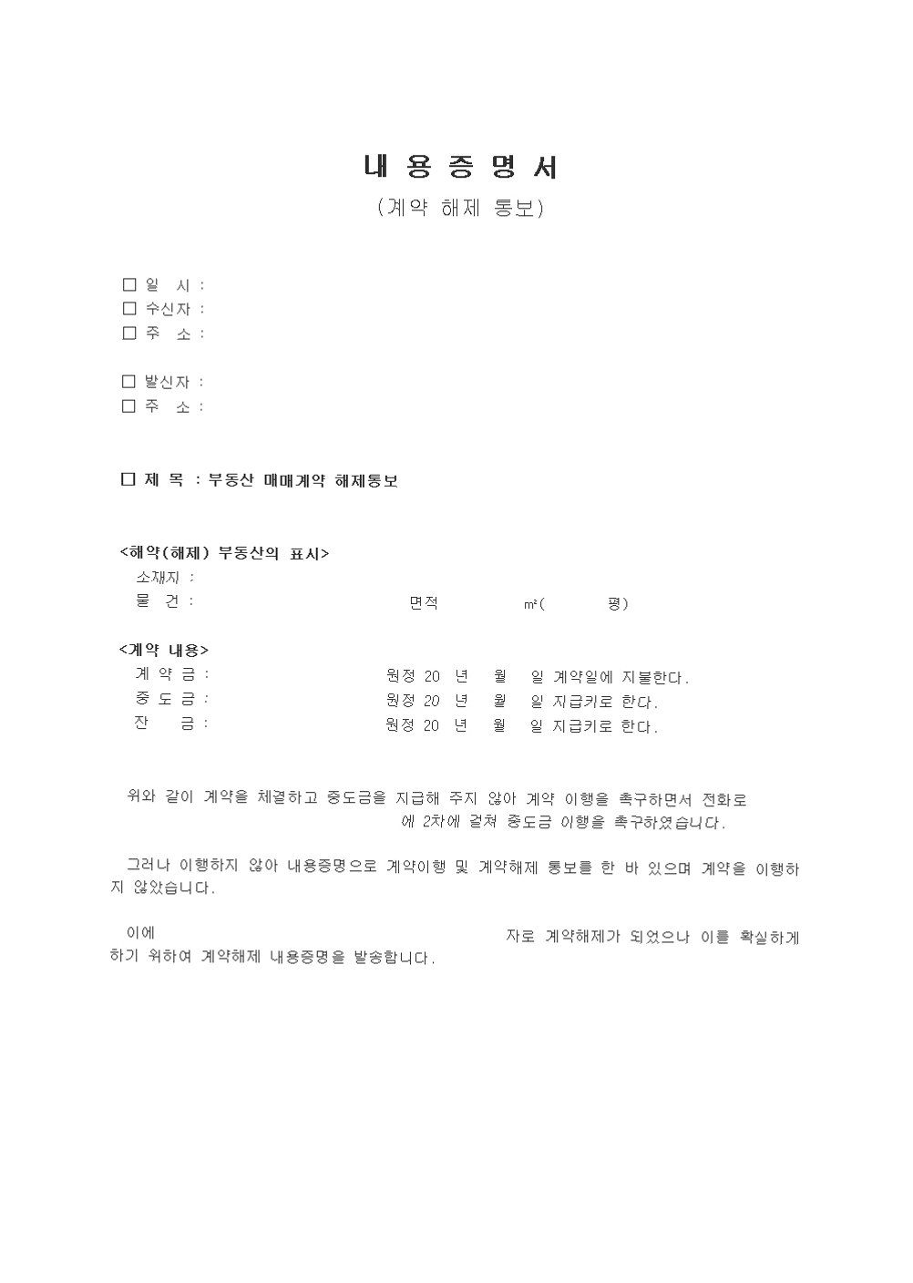 1.  내용 증명 발송: 계약 해제를 통보하는 내용 증명을 작성하여 상대방에게 발송합니다. 내용 증명에는 계약 해제 사유, 해제 의사, 손해배상 요구 여부 등을 명확하게 기재해야 합니다. 이는 추후 분쟁 발생 시 중요한 증거로 활용될 수 있습니다.