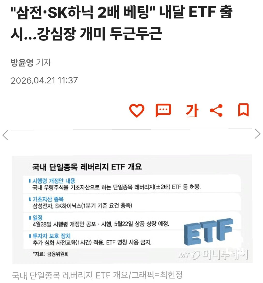 이르면 다음 달 22일, 국내에서도 삼성전자와 SK하이닉스 두 종목을 기초자산으로 하는 2배 레버리지 상장지수펀드(ETF)가 출시됩니다이는 국내 주식형 ETF 최초로 단일 종목을 2배로 추종하는 상품으로, 반도체 투자에 목말랐던 투자자들에게는 수익률을 빠르게 높일 기회로 여겨집니다하지만 높은 변동성을 가진 레버리지 상품인 만큼, 신중한 접근이 필요하다는 목소리도 나옵니다금융당국은 투자자 보호를 위해 기초자산 요건을 까다롭게 설정했으며, 현재 삼성전자와 SK하이닉스만이 이 기준을 충족합니다.