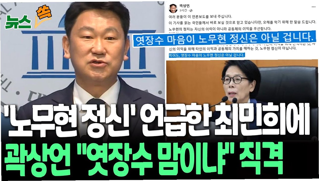 곽상언 의원은 '가치를 무시하고 이익을 추구하는 것, 공동체의 이익이 아니라 자신의 이익을 위해 선택하는 것, 자신의 이익을 위해 타인의 이익과 공동체의 가치를 해하는 것(은) 노무현 정신이 아니다'라고 강하게 비판했습니다. 또한 '적어도 엿장수 마음이 노무현 정신은 아닐 것'이라고 덧붙이며, 최 의원의 발언에 대한 불편한 심경을 드러냈습니다.
