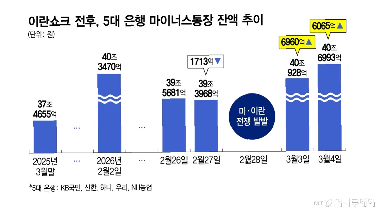 A.최근 중동 지역 불안으로 인한 증시 변동성 확대와 코스피 급락을 '저가 매수'의 기회로 삼으려는 투자자들이 늘면서, 증권사로 이체하기 위한 자금 마련 목적으로 마이너스통장 대출이 급증하고 있기 때문입니다.