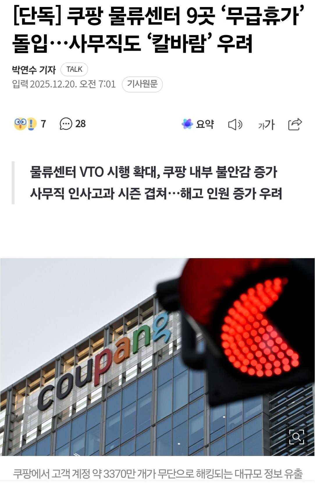 쿠팡의 물류센터 무급휴가 확대와 개인정보 유출 사태로 인한 사무직의 해고 우려가 커지고 있습니다. 물류량 감소와 내부 혼란, 그리고 인사고과 시즌이 맞물려 쿠팡 내부의 불안감이 고조되고 있습니다. 쿠팡은 위기 상황을 타개하기 위해 노력해야 할 것입니다.