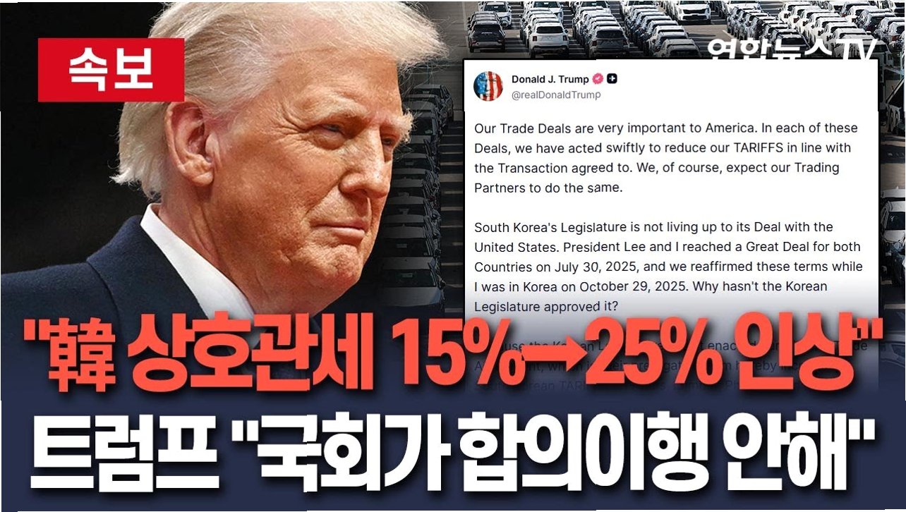 트럼프 대통령은 전날 소셜미디어를 통해 한국 국회의 무역 합의 승인 지연을 이유로 한국산 자동차, 목재, 의약품 등의 관세를 15%에서 25%로 인상하겠다고 발표했습니다하지만 하루 뒤 입장을 바꿔 해결책 모색을 언급한 것은, 대미투자특별법의 국회 처리 등 한국 측의 상황 진전에 따라 관세 재조정의 여지가 있음을 시사한 것으로 보입니다.