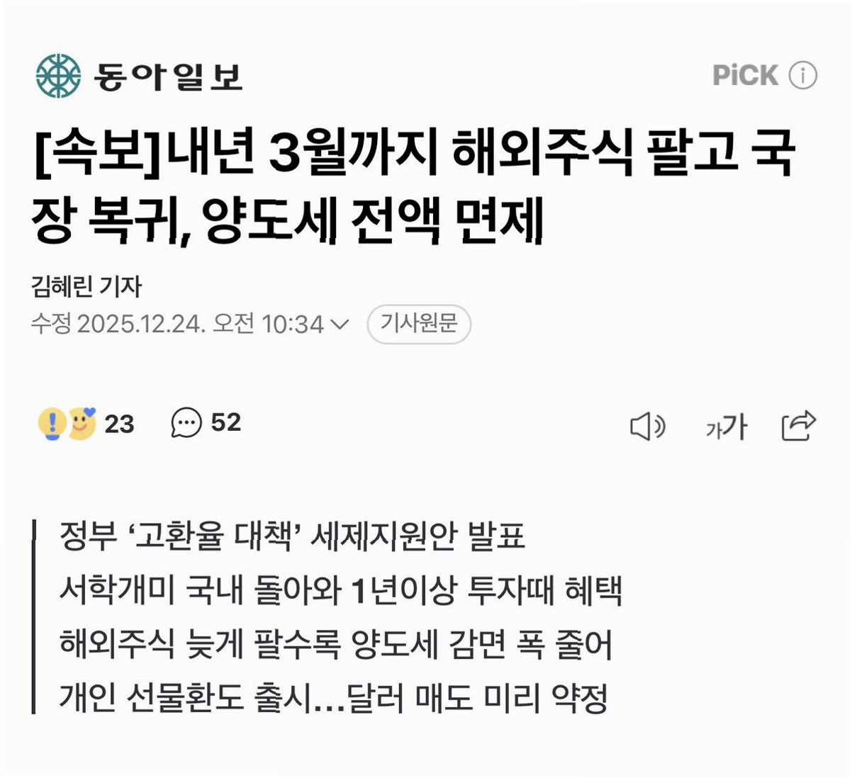 이번 세제 지원 방안은 외환시장 안정과 자본시장 활성화를 동시에 도모하는 획기적인 조치입니다. 최지영 기획재정부 국제경제관리관은 “개인 해외투자자의 국내 복귀를 지원해 외환시장 안정화와 자본시장 활성화를 동시에 도모하는 조치”라고 밝혔습니다. 정부는 이번 조치를 통해 개인 투자자의 해외 주식 보유 잔액 중 상당 부분이 국내 투자를 전환하거나 환헤지를 통해 달러 공급을 늘릴 것으로 기대하고 있습니다. 이는 외환 시장의 안정성을 높이고, 국내 자본시장에 긍정적인 영향을 미칠 것입니다. 이제, 해외 주식 투자를 통해 얻은 자산을 국내로 돌려, 더욱 안정적인 투자를 시작해 보세요.