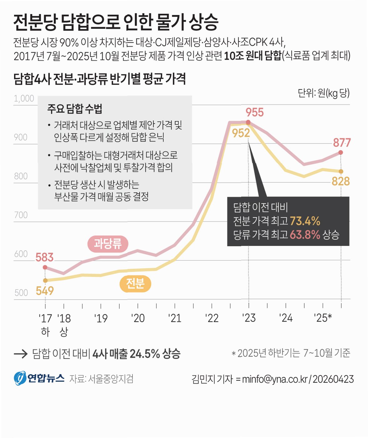전분당 시장의 4개 주요 업체가 8년간 10조 원대 규모의 가격 담합을 벌여왔으며, 수사에 대비해 휴대폰 파쇄 등 증거 인멸 시도까지 한 정황이 드러났습니다. 이로 인해 전분당 가격이 최대 73%까지 폭등하며 소비자들의 부담이 가중되었고, 업체들은 막대한 이익을 취했습니다.