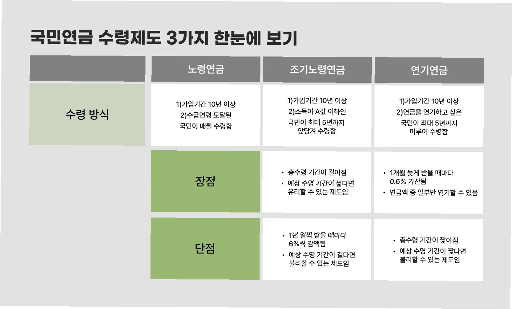 A.연기 연금은 연금 수령 시기를 늦추는 것으로, 1년 늦출 때마다 수령액이 7.2%씩 증가합니다. 최대 5년까지 늦출 수 있습니다.