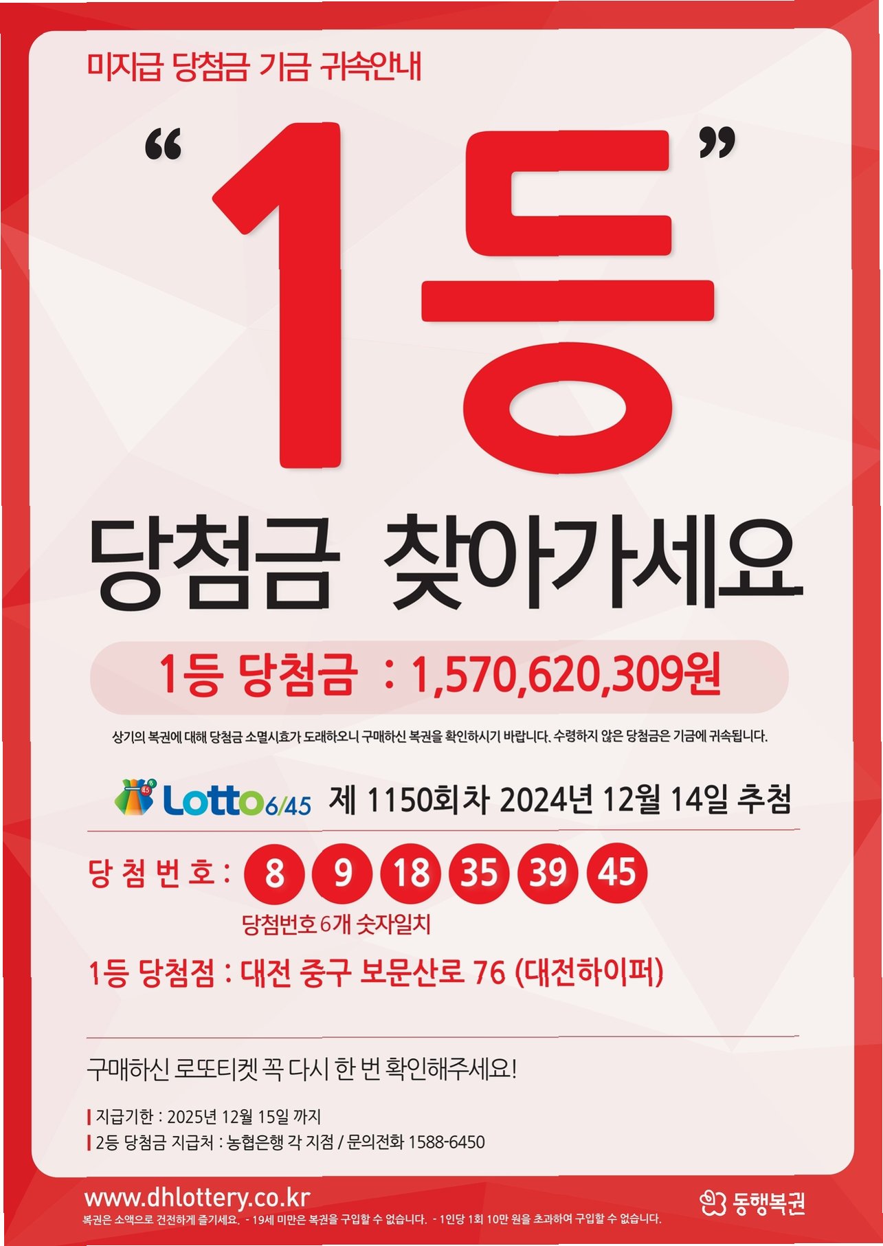 당첨금 지급 기한은 지급 개시일로부터 1년 이내입니다. 1년 안에 당첨금을 수령해야 하며, 만약 지급 기한이 만료되면 당첨금은 복권기금으로 귀속되어 공익사업에 사용됩니다. 당첨금을 받으신 분들은 계획적인 사용으로 더욱 행복한 미래를 만들어가시길 바랍니다.