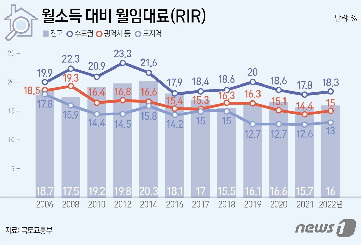 전월세 세입자들의 상황은 어떨까요? 전국 임차 가구의 '월 소득 대비 월 임대료 비중'(RIR)은 15.8%로 전년과 동일했습니다. 월급의 15.8%를 임대료로 지출한다는 것은 결코 적지 않은 부담입니다. 다행히 지역별 임차 가구 RIR은 수도권, 광역시, 도 지역 모두 하락했습니다. 하지만 여전히 높은 임대료는 세입자들의 주거 안정에 큰 걸림돌이 되고 있습니다. 정부의 지속적인 지원과 정책 개선이 절실한 시점입니다.
