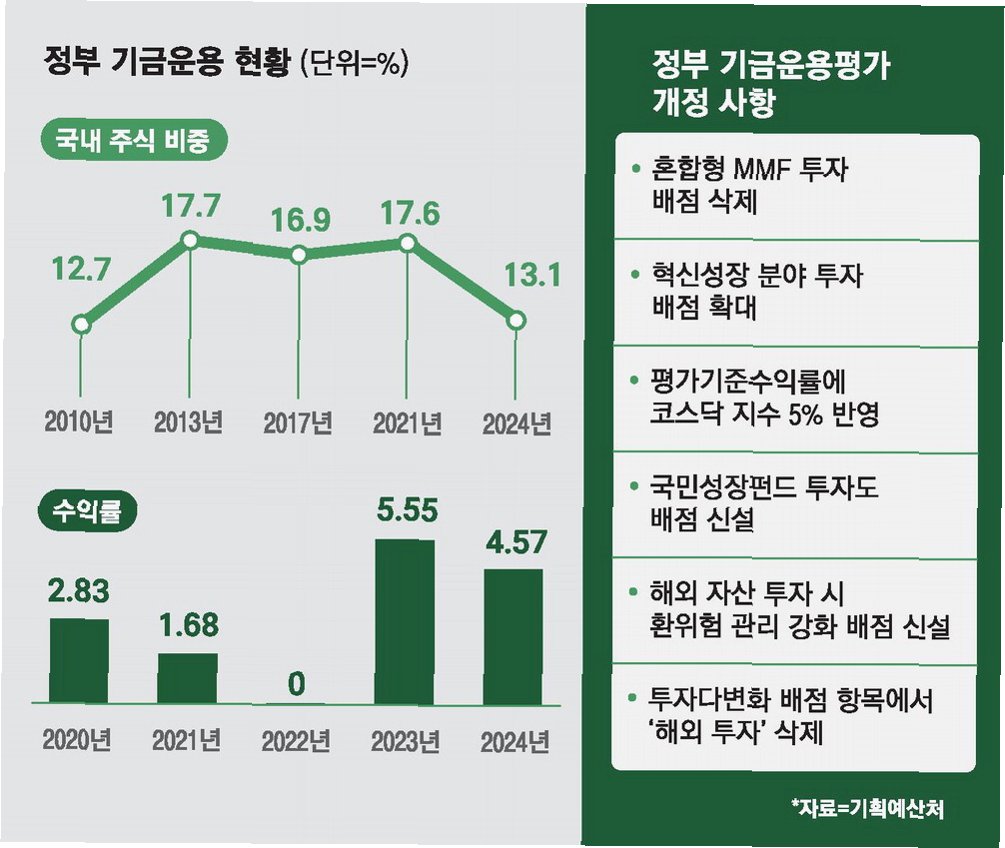 정부가 1400조원 규모의 연기금 코스닥 투자 유도를 위한 평가 체계를 공식화했습니다. '2026년 기금 자산운용 기본방향'에 따라 국내 주식 평가 기준 수익률에 코스닥 지수를 5% 반영하고, 벤처·혁신성장 분야 투자 배점을 확대합니다. 이는 코스피 중심이던 기존 평가 체계에 변화를 주어 연기금의 코스닥 시장 참여를 제도적으로 유도하려는 조치입니다개인 투자자 비중이 높아 변동성이 컸던 코스닥 시장에 장기 기관자금이 유입되면 수급 안정이 개선될 것이라는 기대가 나오고 있습니다.