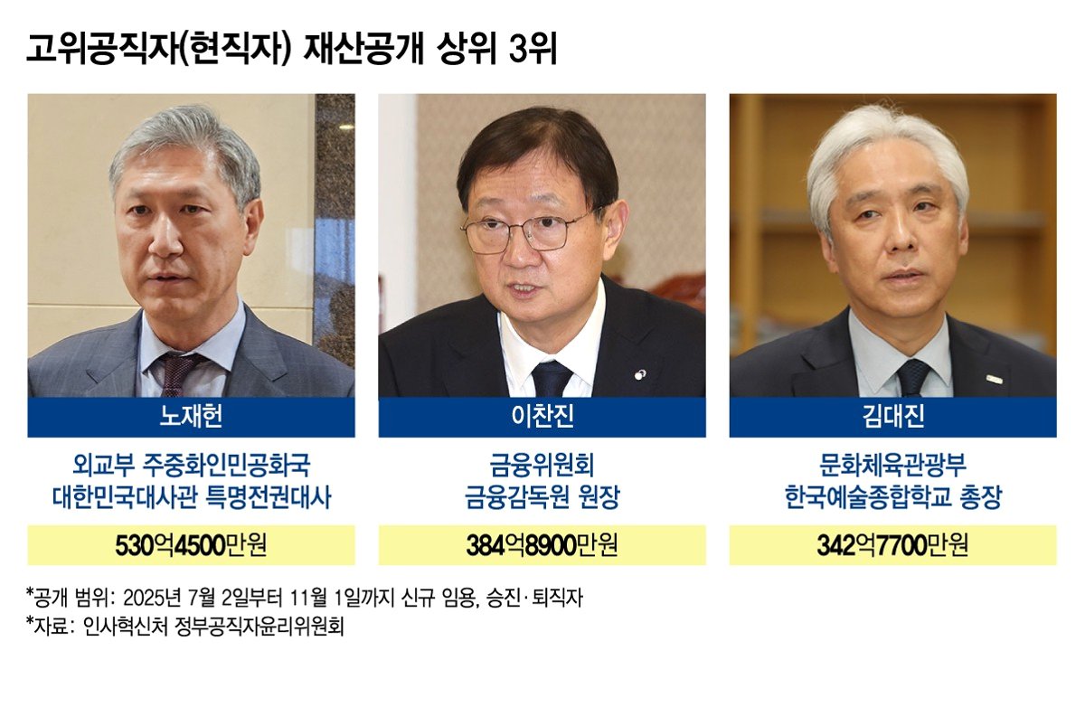 정부공직자윤리위원회는 고위공직자 362명의 재산 변동 내역을 공개했습니다. 이 중 노재헌 주중 한국대사가 530억 원으로 가장 많은 재산을 신고하며 1위를 차지했습니다. 노 대사는 부동산 143억 원, 엔비디아 주식 등 213억 원을 포함한 막대한 자산을 보유하고 있습니다. 이는 이재명 정부 출범 이후 첫 장관급 재산 공개에서 드러난 사실입니다.