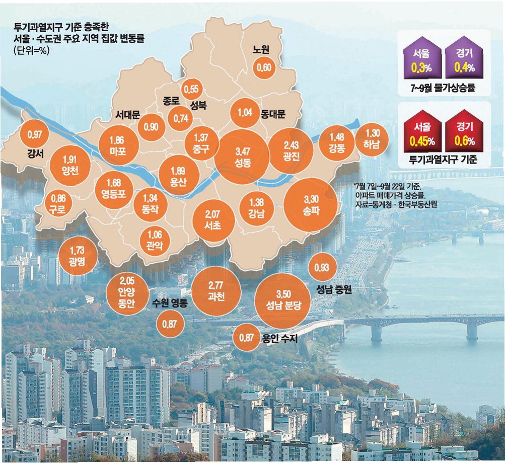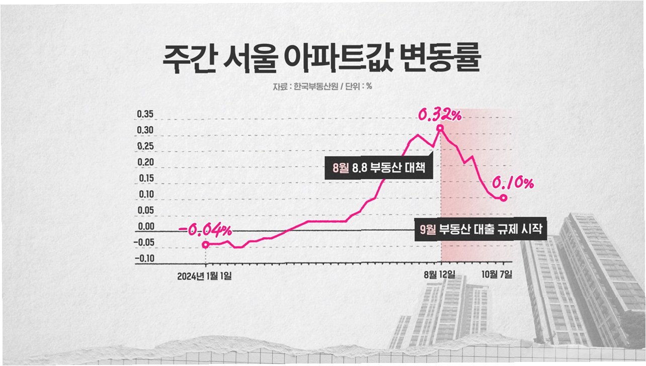 그러나 부동산 시장은 대출 흐름과 달리 여전히 들썩이고 있다. 6·27 대책 이후 주춤하던 서울 아파트값은 9월을 기점으로 다시 오르기 시작했고 그 상승폭은 점차 가팔라지고 있다. 특히 강남권과 마용성(마포·용산·성동), 재건축 단지를 중심으로 매수세가 몰리면서 시장 불안은 수도권으로 확산하고 있다.