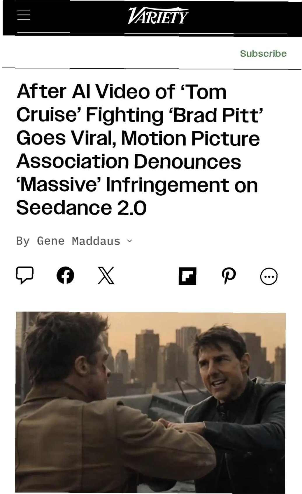 AI가 만든 톰 크루즈와 브래드 피트의 격투 영상, 할리우드를 뒤흔들다