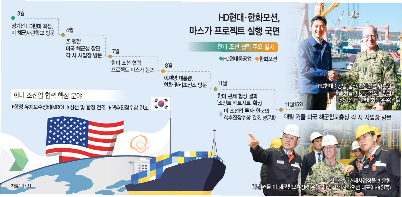 해외 투자도 병행됩니다. HD현대는 미국계 투자사 서버러스캐피털 등과 함께 50억 달러(한화 약 7조3000억원) 규모의 마스가 펀드 조성을 추진 중입니다. 또 미국 조선소 인수·업그레이드, 조선 기자재 공급망 확충 등도 검토하고 있습니다. 미국 방산 조선소 헌팅턴잉글스와는 차세대 군수지원함 공동 건조, AI 방산기업 안두릴과는 무인함정 협력 논의가 이어지고 있습니다.