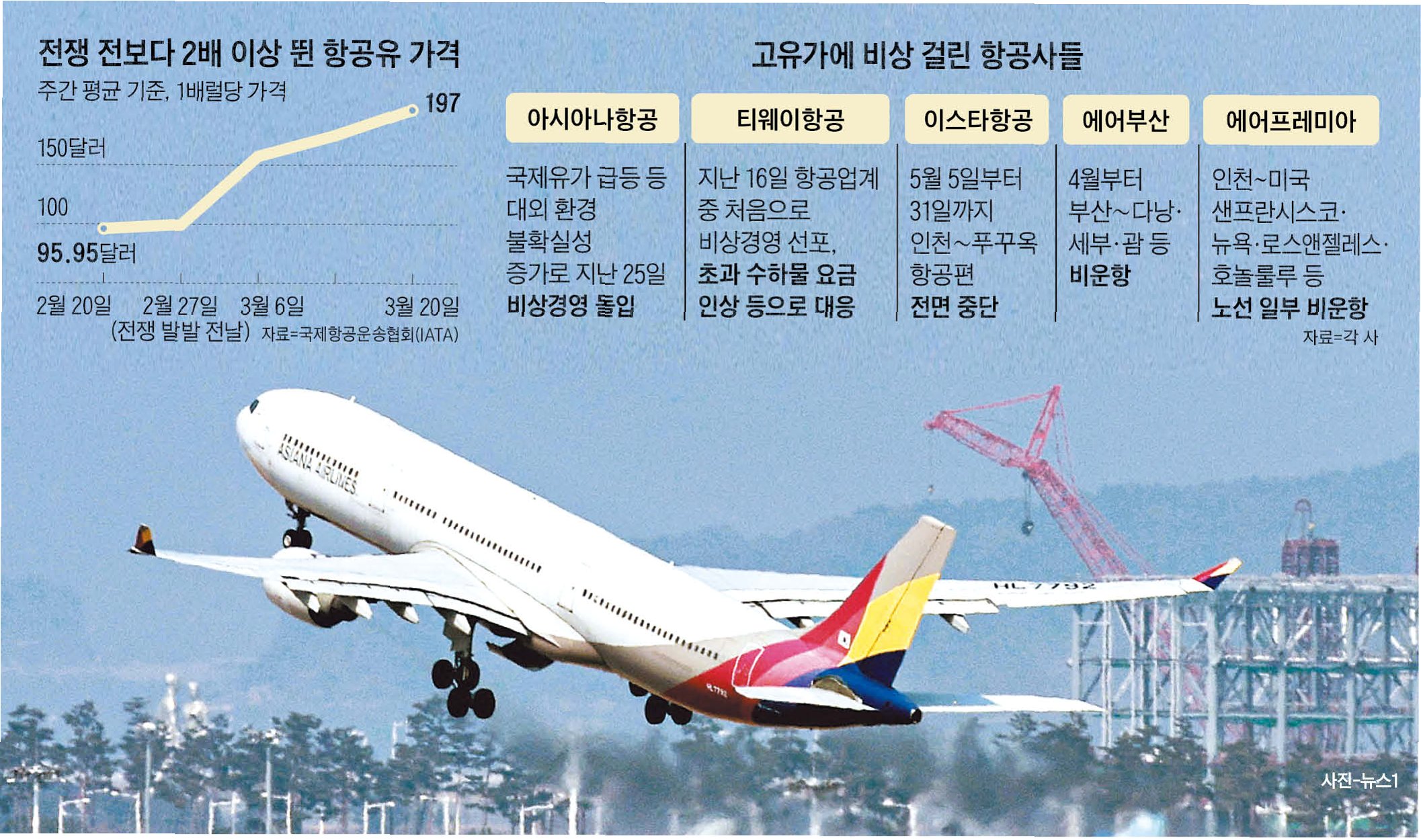 이번 감편은 단기적인 대응을 넘어 구조적인 비용 압박의 신호로 해석됩니다. 항공유는 통상 항공사 영업비용의 20~30%를 차지하는 핵심 비용이며, 여기에 항공기 리스료, 정비비, 공항 이용료 등 주요 비용 대부분이 달러로 결제되기 때문에 고환율까지 겹치면 수익성이 급격히 악화됩니다. 국제항공운송협회(IATA)에 따르면 아시아·오세아니아 지역 평균 항공유 가격은 배럴당 200달러를 웃돌며 전주 대비 10% 이상 상승했으며, 전월 평균과 비교하면 두 배 가까이 오른 수준입니다. 현재 흐름이 이어질 경우 유류할증료도 추가 인상될 가능성이 매우 높습니다.