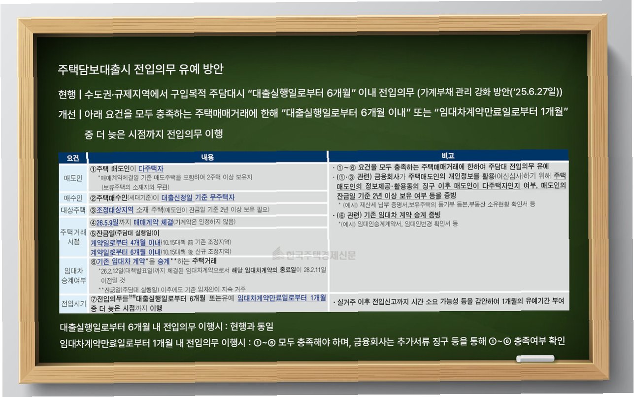 이번 보완책에는 세입자가 있는 집을 무주택자가 매수할 경우, 기존 세입자의 계약 기간에 따라 최대 2년까지 실거주 의무를 미뤄주는 내용이 포함되었습니다. 또한, 세입자 계약이 6개월 미만으로 남았다면 무주택자가 아니어도 매수가 가능하며, 주택담보대출 시에도 세입자가 있다면 임대차 종료 후 1개월까지 전입을 늦출 수 있게 되었습니다. 이러한 조치들은 다주택자들이 급하게 매물을 내놓기보다 상황을 지켜볼 수 있는 여지를 제공합니다.