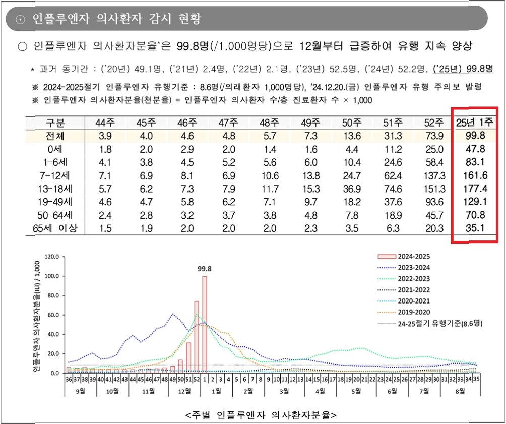 현재 유행하는 독감 바이러스는 A형(H3N2)이며, 일부 변이가 확인되었지만, 현재 접종 중인 백신은 여전히 효과가 있습니다. 의원급 의료기관에서의 인플루엔자 바이러스 검출률은 44주에 19.0%에서 46주에 36.9%로 급증했으며, 이는 지난해 같은 시기 검출률(3.6%)의 10배 수준입니다. 병원급 의료기관에서의 독감 입원 환자 수도 증가 추세에 있습니다.