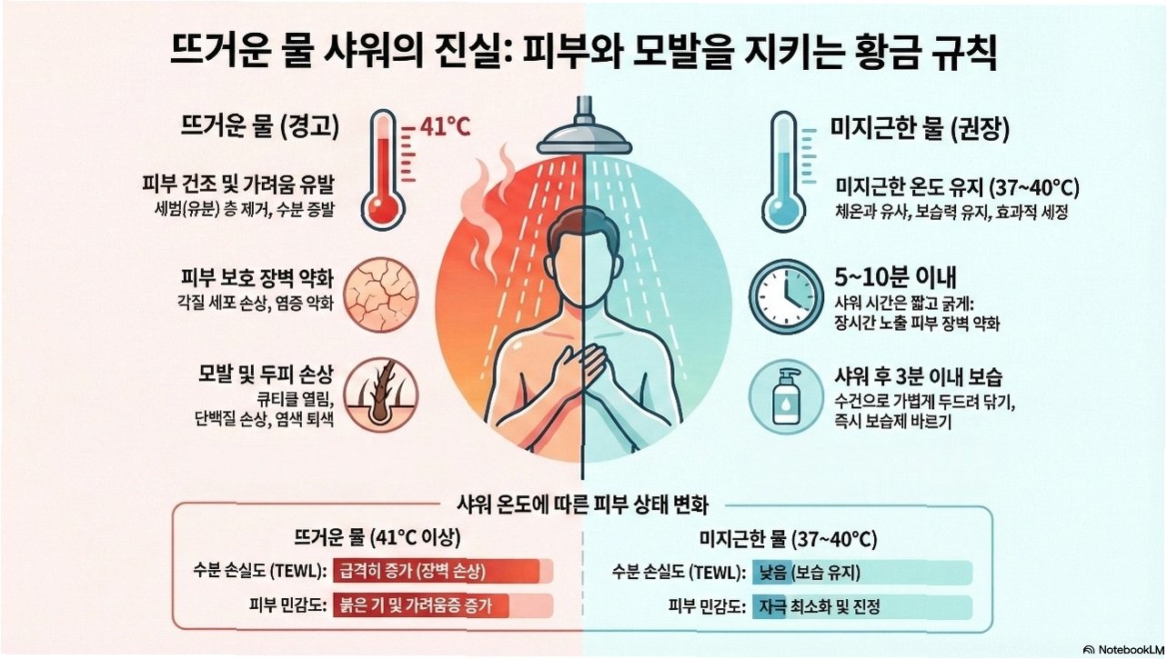 뜨거운 물로 오래 샤워하는 습관은 피부에 상당한 부담을 줍니다. 연구 결과에 따르면 뜨거운 물은 피부 수분 손실을 증가시키고 피부 장벽을 약화시키며 붉어짐을 유발합니다. 전문가들은 샤워 온도를 37~40도로 유지하고, 샤워 시간은 10분 이내로 제한할 것을 권고합니다. 하루 두 번 샤워가 불가피하다면, 한 번은 세정제 없이 물로만 헹구는 것이 좋습니다.