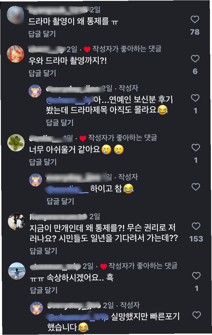 온라인 커뮤니티와 SNS를 통해 시민들의 불만이 쏟아졌습니다. '개금벚꽃길에 갔다가 허탕 쳤다', '멀리서 보러 왔는데 전세 내고 통제하는 게 맞나요?', '허가도 없이 길 막고, 드라마 촬영이 무슨 벼슬인가' 등의 반응이 이어졌습니다. 촬영팀의 사진 촬영 및 통제에 대한 강압적인 태도에 대한 불만도 제기되었습니다. 유명 관광지임에도 불구하고 촬영으로 인한 통제에 대한 사전 정보가 부족했으며, 안내는 입구에 게시된 현수막이 전부였습니다. 이로 인해 3일까지 촬영이 계속된다는 잘못된 정보가 퍼지기도 했습니다.