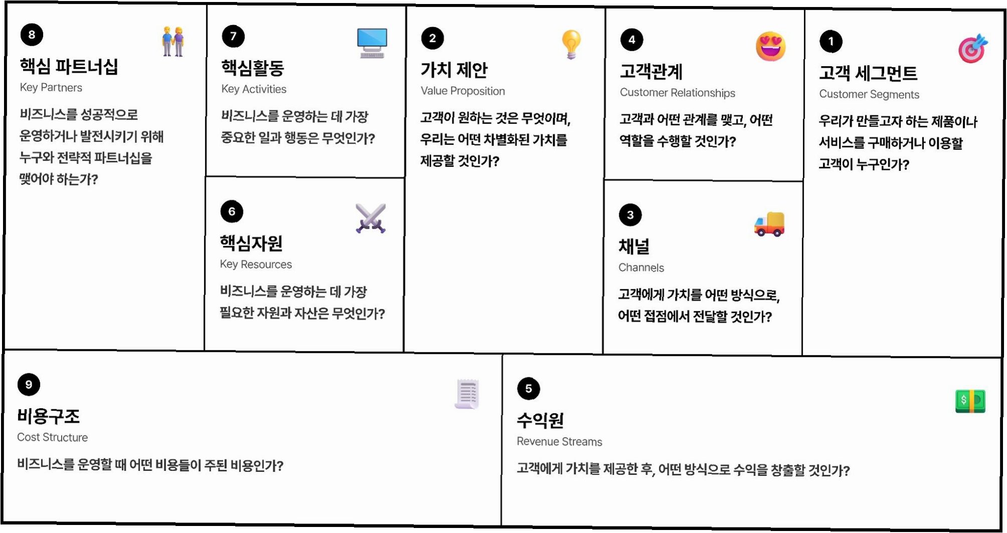 이 9가지 요소를 통해, 사업의 전체적인 그림을 그리고, 각 요소 간의 관계를 파악하여 사업의 효율성을 높일 수 있습니다.
