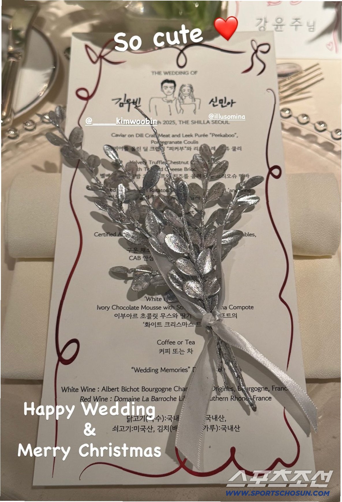 청첩장에 이어 결혼식 메뉴 카드 역시 많은 이들의 시선을 사로잡았습니다. 메뉴 카드에는 두 사람의 상반신을 그린 사랑스러운 일러스트가 담겨 있으며, 아기자기한 꽃다발 장식이 더해져 따뜻하고 로맨틱한 분위기를 자아냈습니다. 이러한 세심함은 결혼식의 특별함을 더하며, 참석한 하객들에게 잊지 못할 추억을 선사했을 것입니다. 신민아와 김우빈은 결혼의 모든 순간을 특별하게 만들고자 노력했습니다.