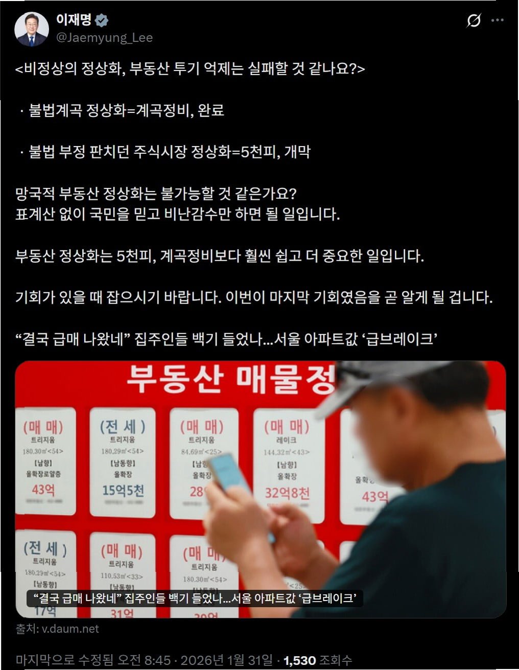 이 대통령은 '종묘 앞 고층 개발은 안 되고, 태릉 옆 주택 개발은 되나'라는 기사를 공유하며, 문화유산 보호를 이유로 종묘 인근 개발에는 부정적이면서 주택 공급을 위해 태릉 개발을 추진하는 정부 방침의 이중성을 지적했습니다. '거울 화법'을 통해 동일 사안에 대한 상반된 입장의 차이를 질문하며, 정책 결정 과정에서의 일관성과 형평성을 촉구했습니다.