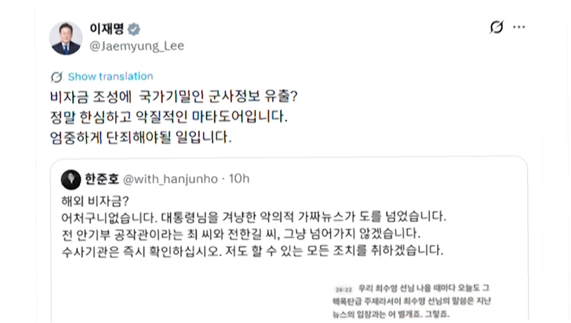 이 대통령은 친명계로 분류되는 한준호 더불어민주당 의원의 글을 공유하며 전 씨의 주장을 재차 비판했습니다. 한 의원은 전 씨의 주장을 '어처구니없는 가짜뉴스'라 칭하며, 전직 안기부 공작관 출신 최 씨와 전한길 씨에 대해 "그냥 넘어가지 않겠다"고 밝혔습니다. 또한 수사기관의 즉각적인 확인과 함께 본인 역시 가능한 모든 조치를 취할 것이라고 강조했습니다.