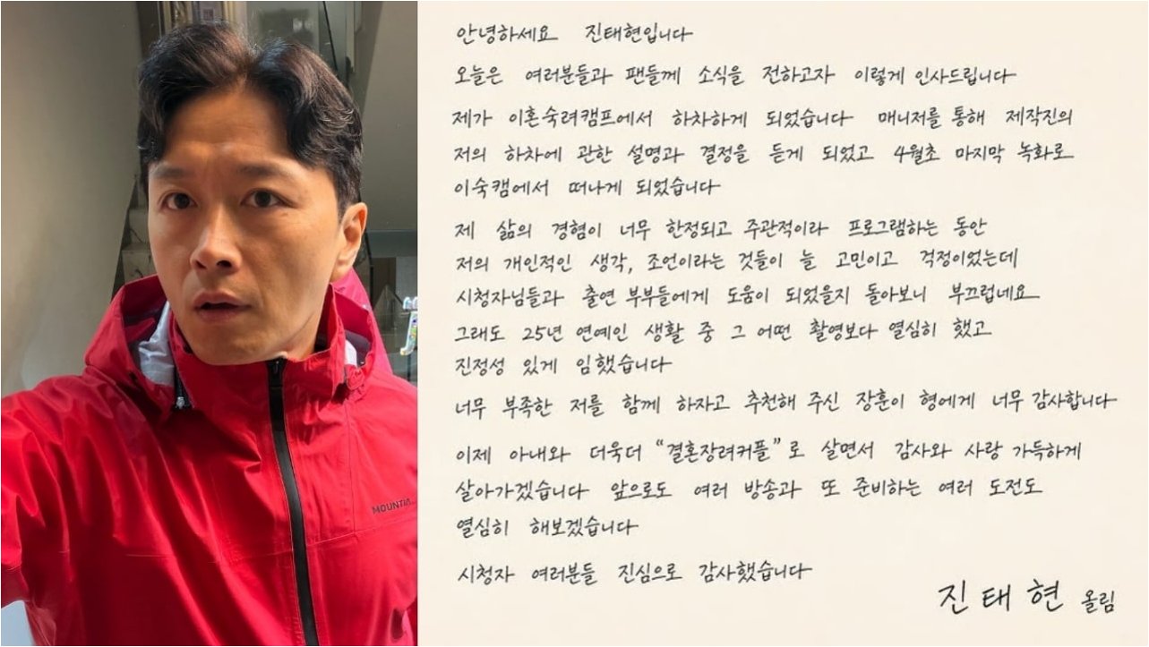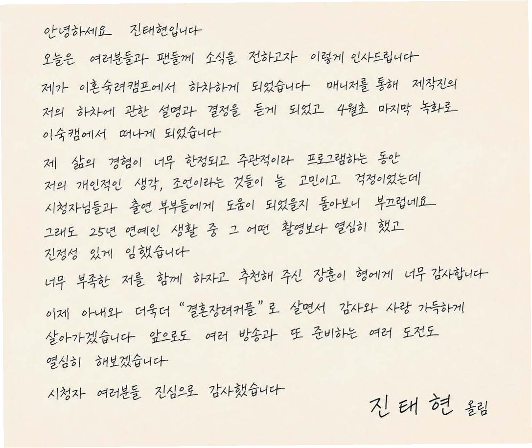배우 진태현이 JTBC '이혼숙려캠프'(이하 '이숙캠')에서 하차하게 되었음을 자필 편지로 직접 밝혔다. 그는 4월 초 마지막 녹화를 끝으로 프로그램을 떠나게 되었으며, 매니저를 통해 제작진의 하차 결정에 대한 설명을 들었다고 전했다. 아직 방송 분량이 남아있지만, 기사가 먼저 보도되어 미리 팬들에게 소식을 전하게 되었다고 덧붙였다.