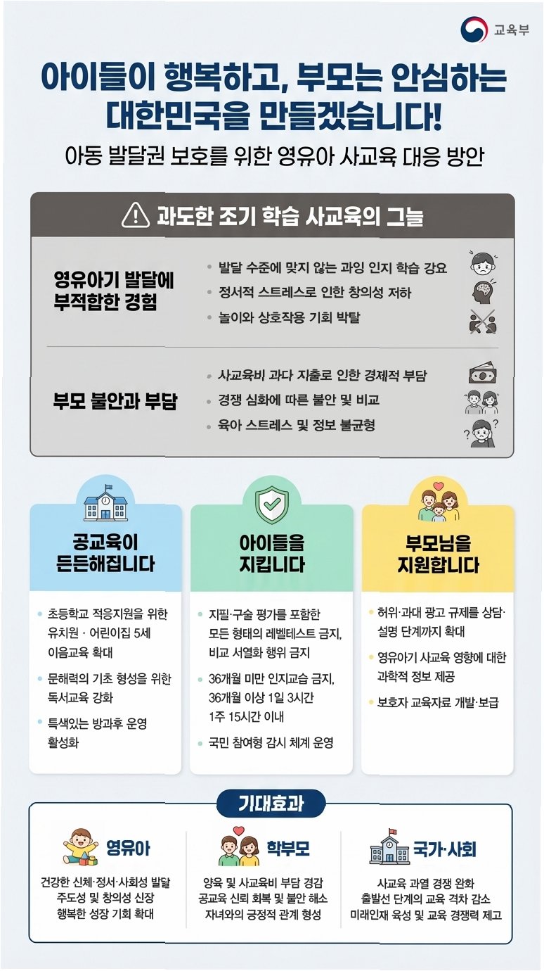교육부는 유아교육학회, 뇌신경학회, 소아학회 등 전문가 집단과 협력하여 과학적 근거에 기반한 인식개선 콘텐츠를 제작하고, '유아 사교육비 본조사'를 매년 실시하여 데이터를 기반으로 한 영유아 사교육 맞춤형 정책을 마련할 계획입니다. 최교진 교육부 장관은 "영유아의 발달권을 최우선으로 보호하겠다"며, 국가가 책임 있게 지원하여 건강한 성장을 돕겠다고 밝혔습니다.
