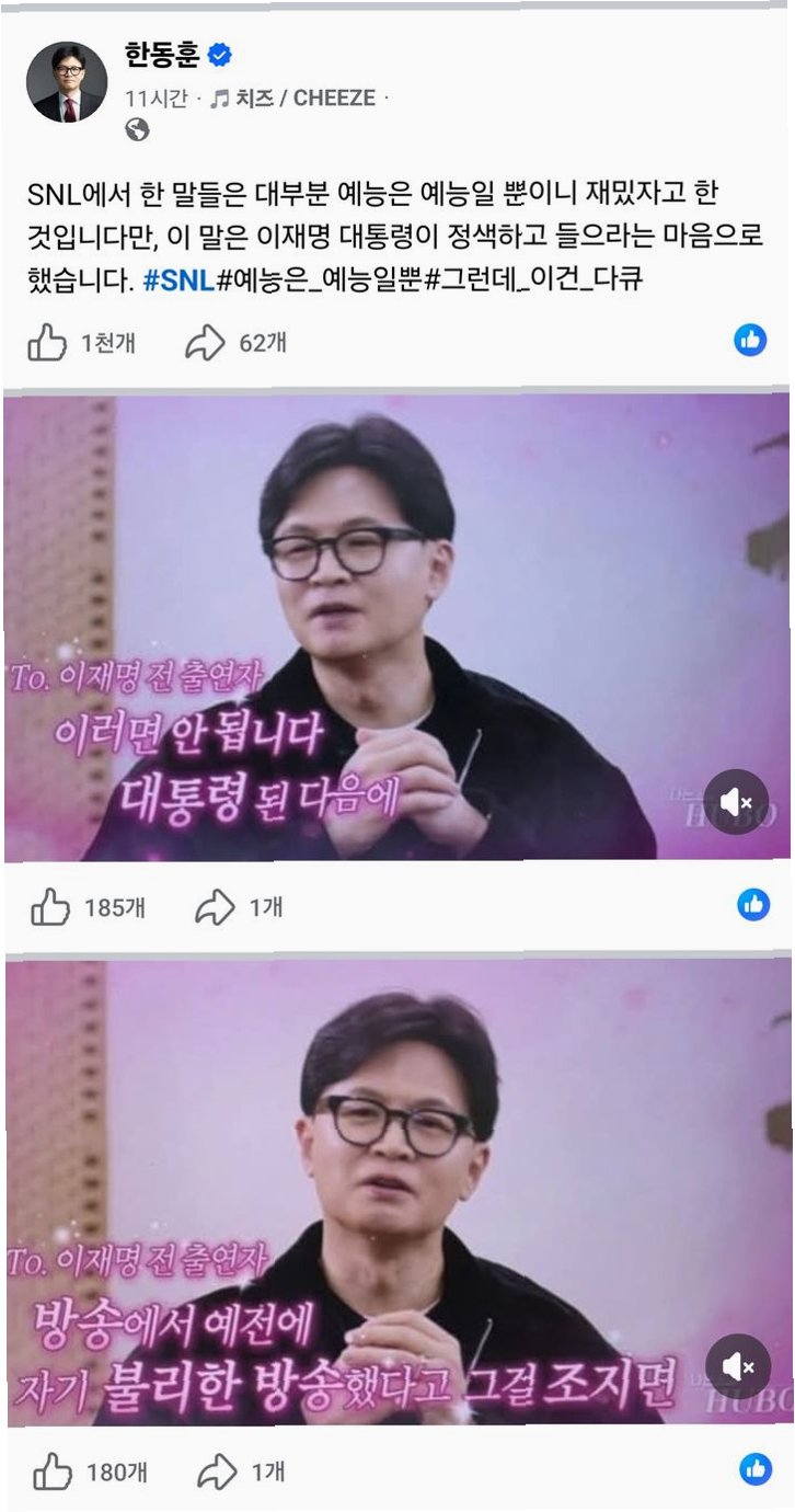 한 전 대표는 이 대통령에게 영상편지를 남겨달라는 요청에 '대통령 된 다음에 방송에서 예전에 자기한테 불리한 방송했다고 그걸 조지면 나라 꼴이 뭐가 되겠는가'라며 '정치를 좀 대승적으로 하라'고 조언했습니다. 그는 이 장면을 SNS에 올리며 'SNL에서 한 말들은 대부분 예능은 예능일 뿐이니 재밌자고 한 것이지만, 이 말은 이 대통령이 정색하고 들으라는 마음으로 했다'고 덧붙였습니다. 특히 '예능은 예능일 뿐 그런데 이건 다큐'라는 해시태그를 남기며 자신의 발언이 단순한 농담이 아님을 강조했습니다.