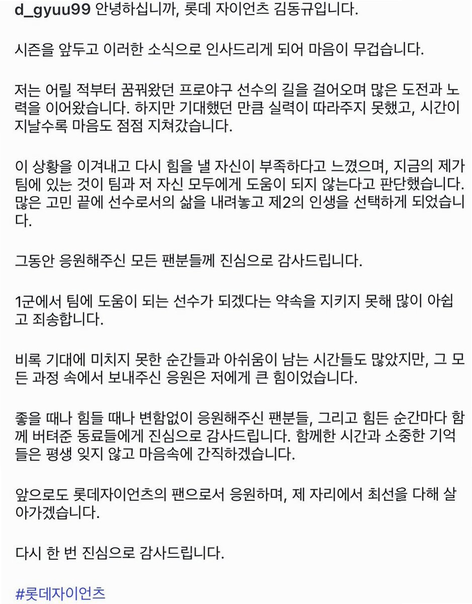 김동규 선수는 팬들에게 '응원해주신 모든 팬분들께 진심으로 감사드린다'며, 1군에서 팀에 도움이 되는 선수가 되겠다는 약속을 지키지 못한 것에 대한 아쉬움과 미안함을 표현했습니다. 그는 '비록 기대에 미치지 못한 순간들과 아쉬움이 남는 시간들도 많았지만, 그 모든 과정 속에서 보내주신 응원은 저에게 큰 힘이었다'고 말했습니다. 또한, 힘들 때 함께 버텨준 동료들에게도 감사를 표하며, 롯데 자이언츠의 팬으로서 앞으로도 응원하겠다고 다짐했습니다.